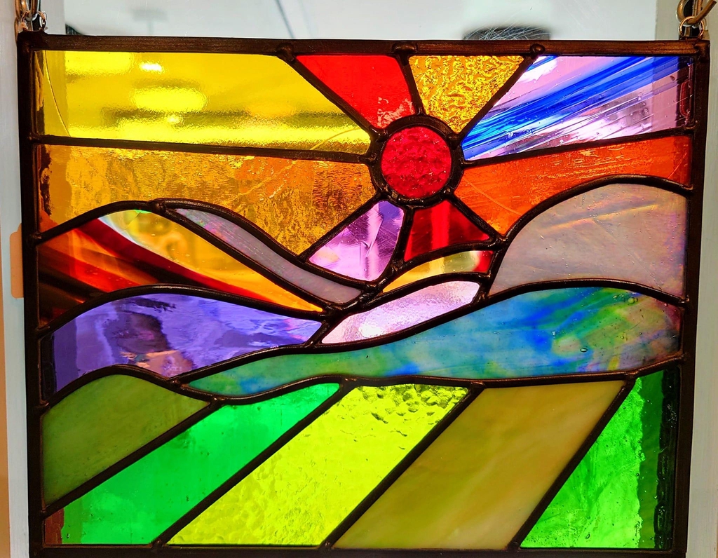 For traditional stained glass designs, I create windows, doors, and hanging panels. My process for fused glass involves using Bullseye glass, powders, and frits. I often combine fusing, enamelling, and silver staining techniques to achieve a unique look. Each piece is carefully crafted to bring out the vibrant colours and details that make stained glass so captivating.